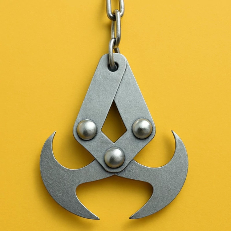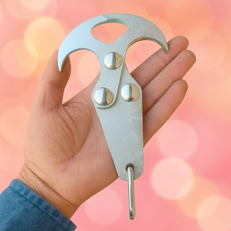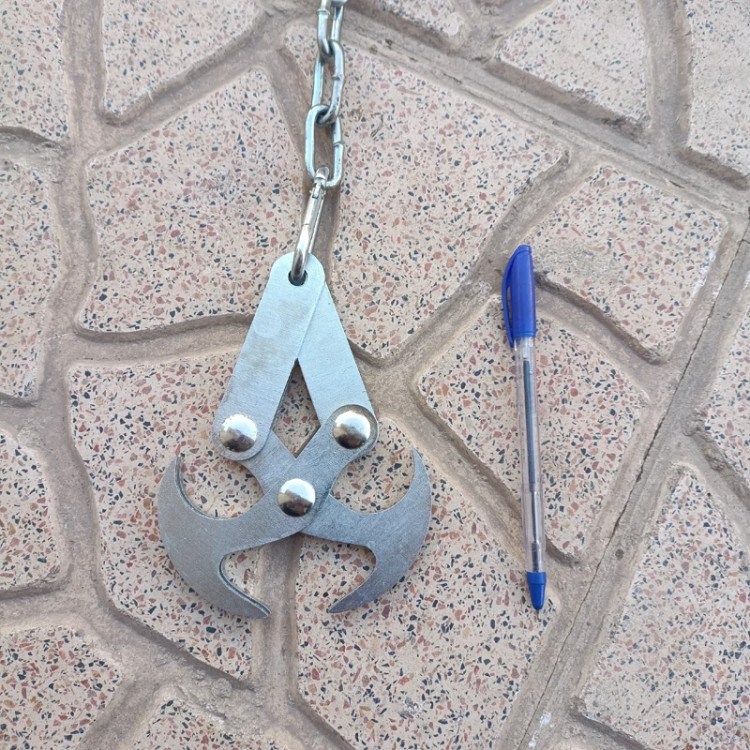 ساختار فنی - از دو بازوی فلزی خمیده تشکیل شده که در انتها به شکل چنگک طراحی شدهاند. - بازوها با پیچ محکم به یکدیگر متصل شدهاند و قابلیت حرکت دارند، یعنی میتوانند باز و بسته شوند. - در قسمت بالایی، یک حلقه کارابین برای اتصال به زنجیر یا کابل تعبیه شده است. - جنس قطعات از آهن گالوانیزه ساخته شده